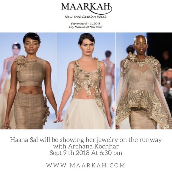 “My sculptures are a cornucopia of planes, textures, tonalities, resonances, moods, emotions, morality, chaos and more. And finally, my sculptures are the voice of color. Color is fundamental to the human spirit. It alleviates, invigorates, humanizes us. . . and I let it serenade.” – Hasna Sal. She will be partnering with Archana Kochar as the first show in the New York Fashion Week “Maarkah” Event. Models will be walking the runway with Archana Kochar gowns and Hasna Sal’s Jewelry.