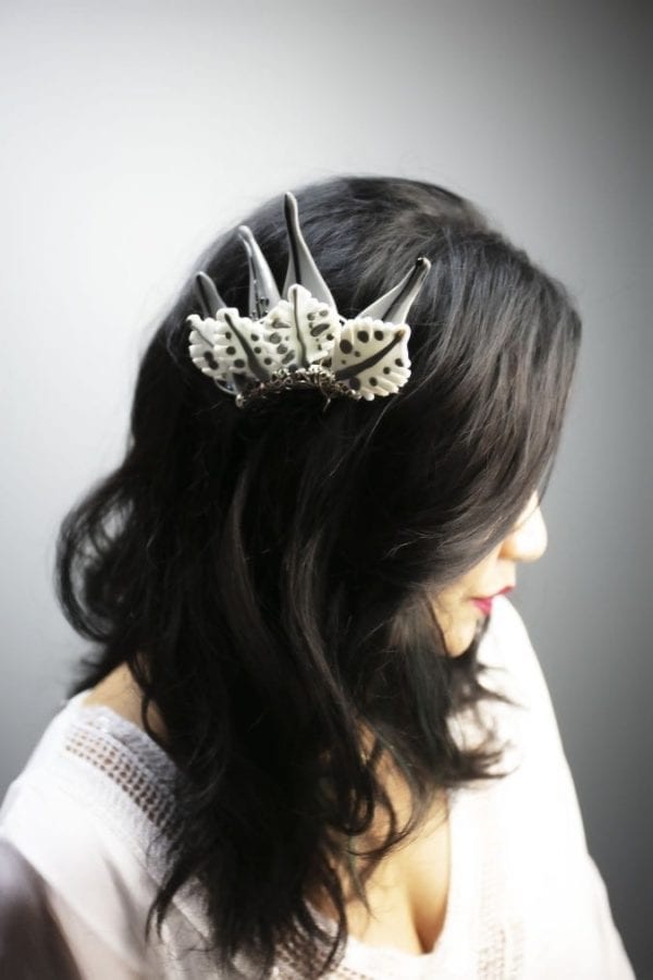 Presenting with Archana Kochar is international glass sculptor Hasna Sal. Hasna will be displaying her new collection of handcrafted glass jewelry. Hasna is known for her hand-made glass installations that use bold colors and flowing shapes, to convey emotion and energy.